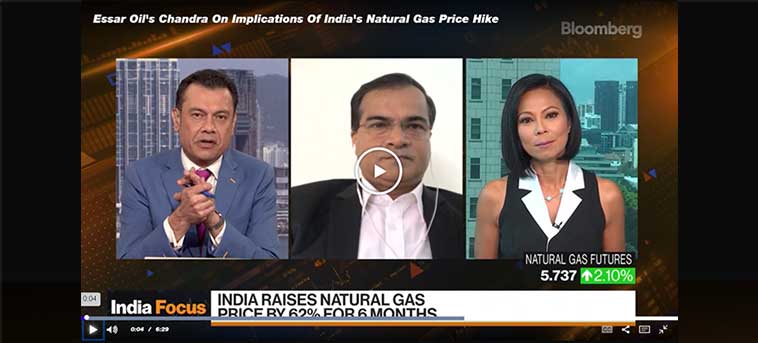Speaking with Bloomberg Asia, Santosh Chandra – CEO, Essar Oil and Gas Exploration and Production Ltd. (EOGEPL), discusses how India’s natural gas price hike will spur exploration and attract investments.